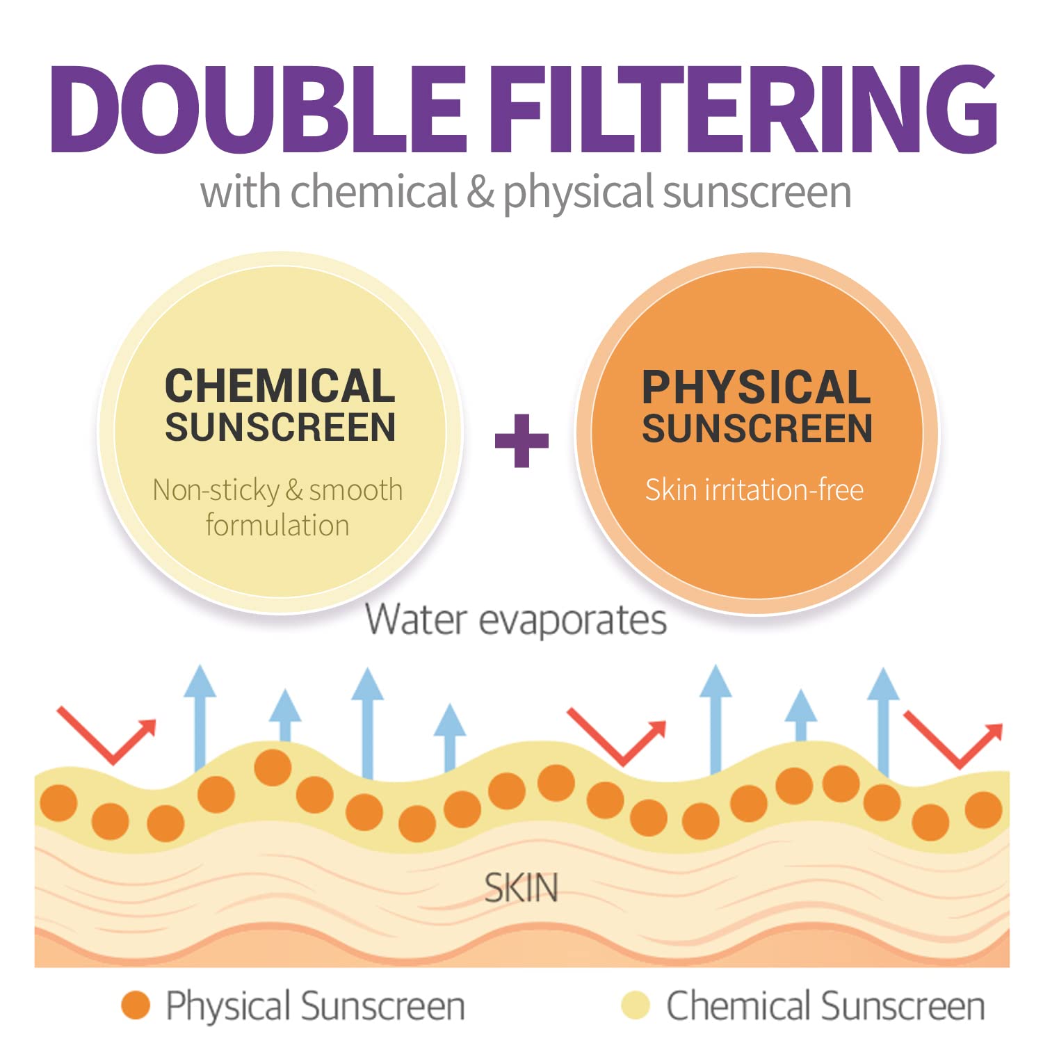 - DUAL PROTECTION WITH DOUBLE FILTERING: This sunscreen provides you with complete protection both chemically and physically. The chemical formula protects your skin from harmful sun-ray exposure with special ingredients. The physical finish provides a smooth, non-sticky finish. This way, your skin remains protected completely from UV rays. The creamy texture and smooth finish give a tone-up effect and make your skin glow.
